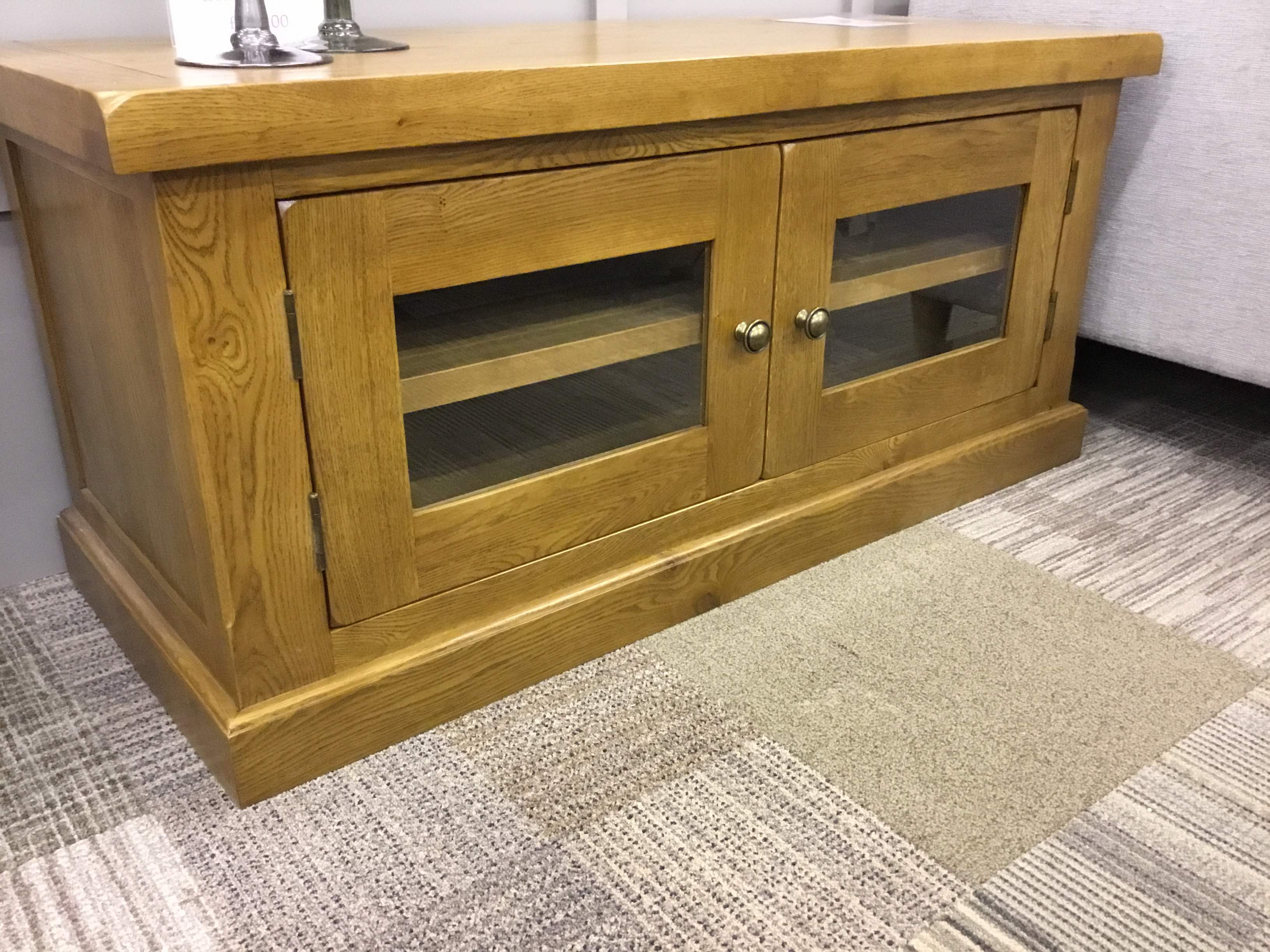 Medium oak TV stand with glass doors. Discontinued. Sale price £249.00 |